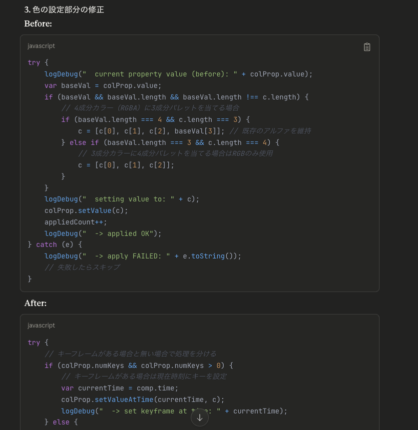 Claudeでは3回ほどやり取りをした後、ようやくシェイプレイヤーに色を反映することができました。