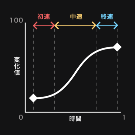 イージングをつけることで、初速、中速、終速の速度をカーブで変化させることができるようになります。