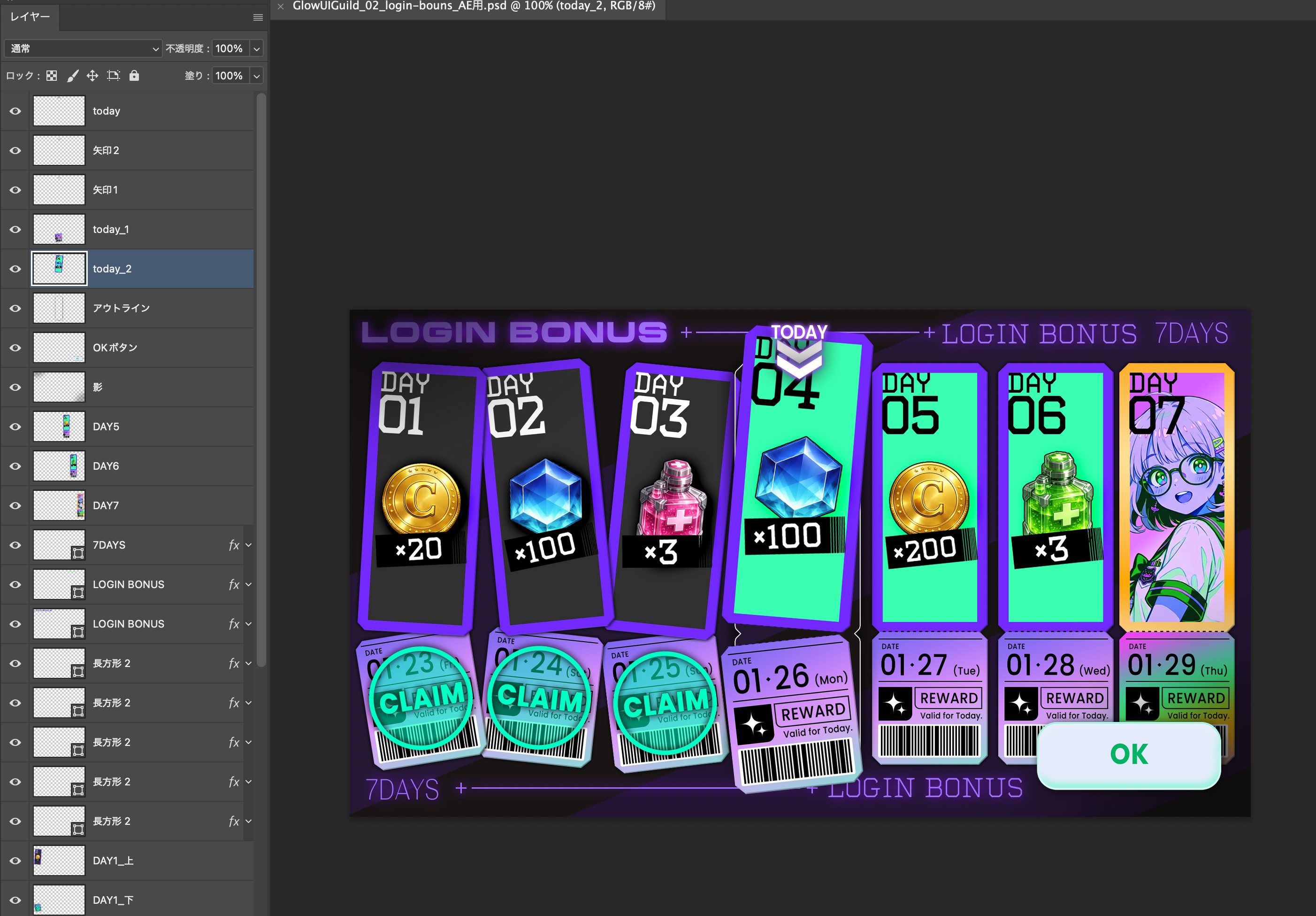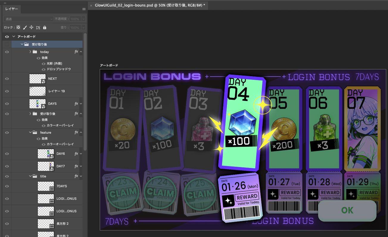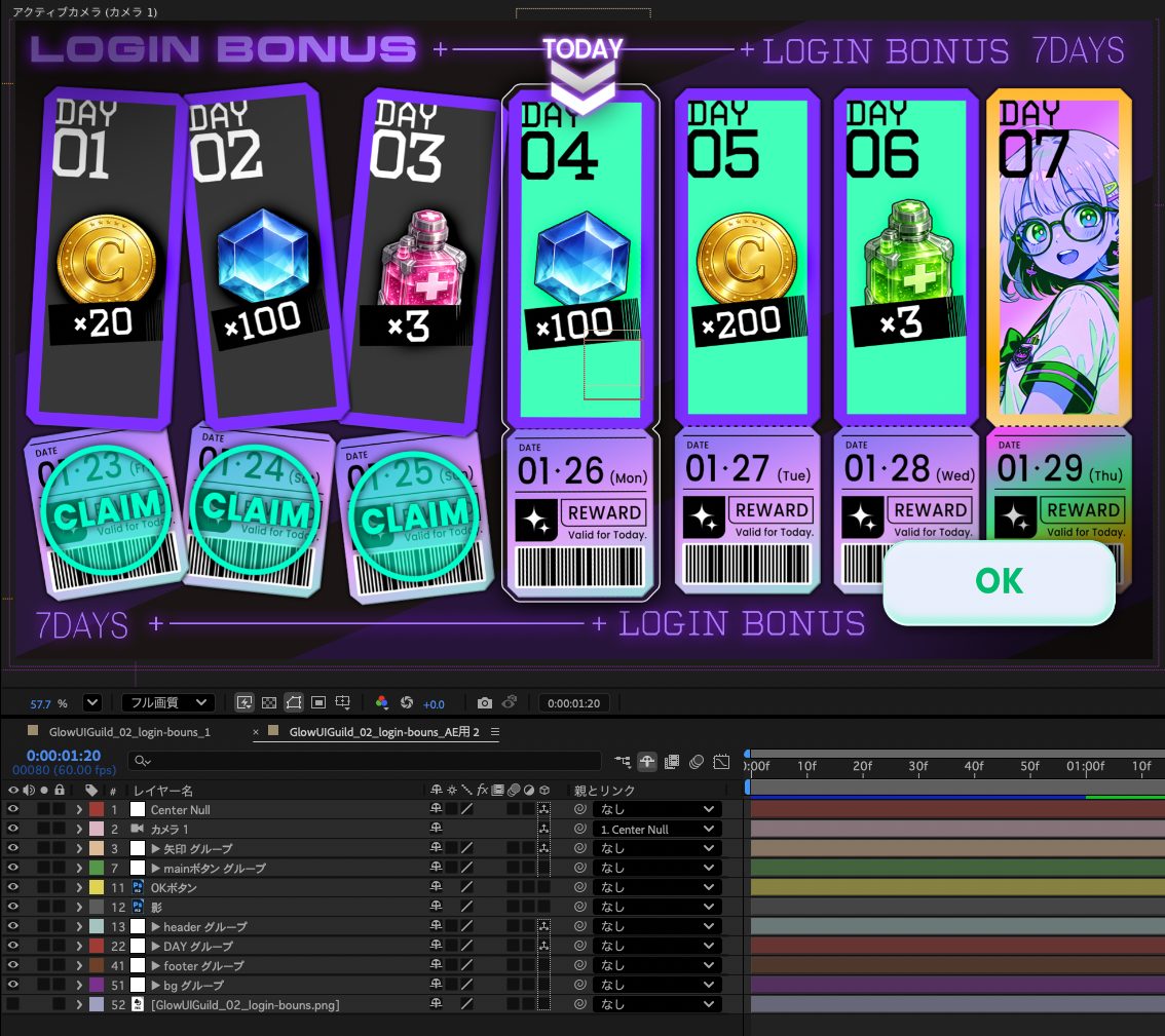 斜めから入ってXの角度を少し上下に振って立体感を強めつつ、CLAIMマークもつけてログボの受け取りを強調します。